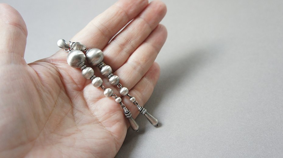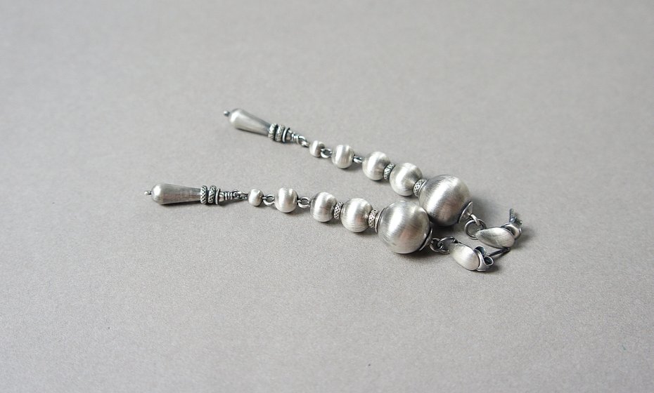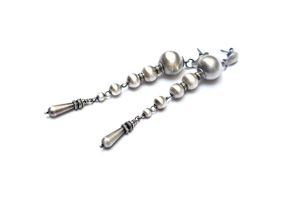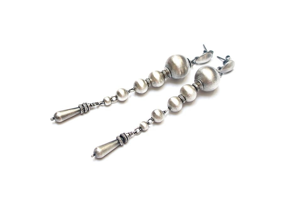 Kolczyki wykonane ze srebra [pr.925] w połączeniu ze srebrnymi kuleczkami [ 12mm,8mm , 7mm,6mm],4mm oraz srebrnymi kropelkami [14mm]. Srebro oksydowane i przetarte. Całkowita długość kolczyków około 8,8cm. Biżuteria ozdobnie zapakowana.
