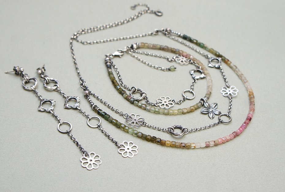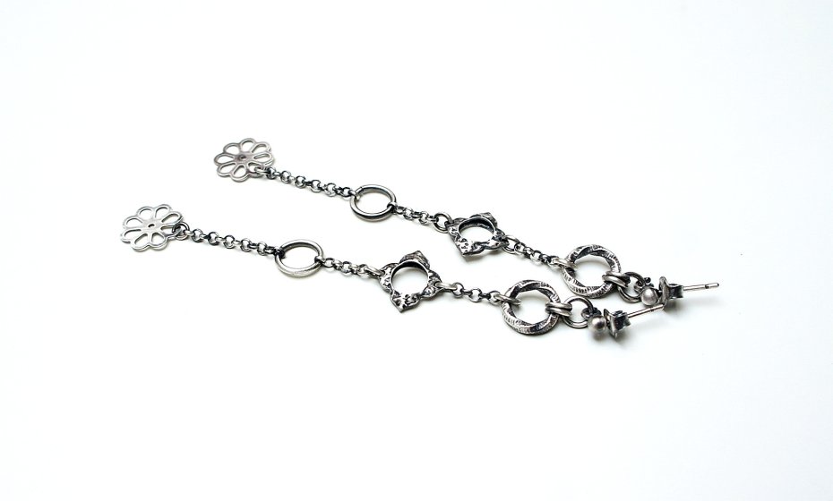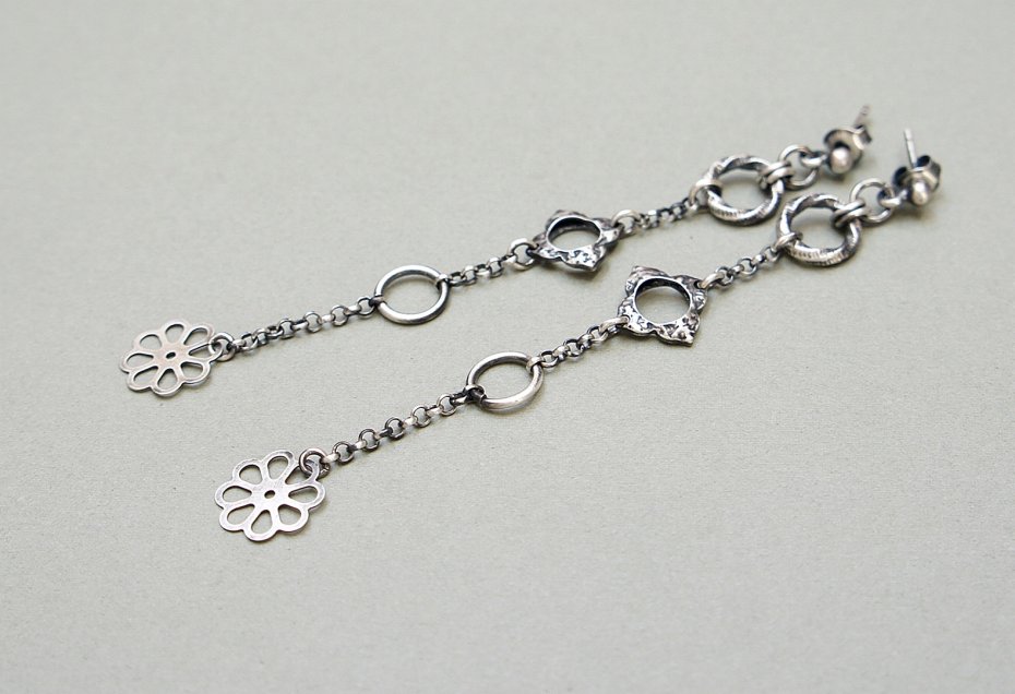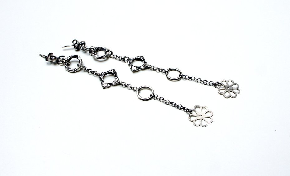 Kolczyki ze srebra [pr. 925] w połączeniu ze srebrnymi ogniwkami i kwiatuszkami Srebro częściowo oksydowane i przetarte. Całkowita długość kolczyków 9cm. Biżuteria ozdobnie zapakowana.