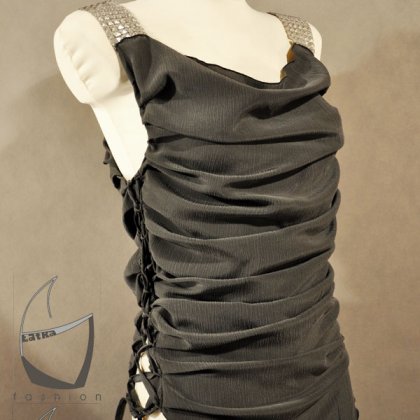 Śliczna tunika z najnowszej kolekcji wiosna-lato 2010! Rozmiar 38 (obwód klatki piersiowej ok.: 88cm, obw.talii ok.: 70cm, obw.bioder ok.: 94cm), możliwość zamówienia w każdym innym rozmiarze. Bluzk0-tunika niezwykle malownicza i kobieca, dzięki drapowaniom po bokach. Wykonana z grafitowej, karbowanej wiskozy z jedwabiem. Po prawej stronie wiązania na taśmę i pętelki z tej samej tkaniny, dzięki czemu sama regulujesz obwód dołu bluzki i jej charakter. Ramiączka wykonane z ozdobnych taśm, w postaci połączonych kwadracików-piramidek o srebrnej barwie, co nadaje drapieżnego charakteru projektowi bluzki. Dekolt-woda (tył i przód), dół tuniki wykończony trójkątnie. Polecam gorąco, jako uniwersalny ubiór casualowo-wieczorowy, znakomity zarówno do pracy, jak i na wieczorny wypad.