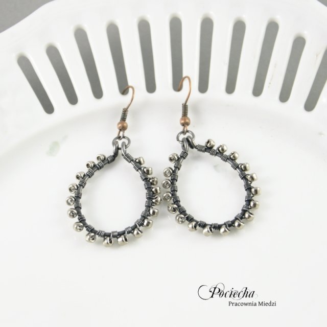 Stworzone ręcznie z miedzi i koralików szklanych toho o pięknym srebrnym blasku. Bigle antyalergiczne.