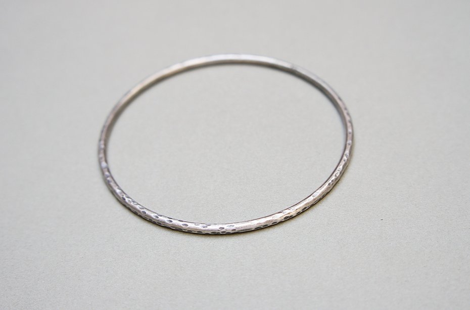 Bransoletka wykonana własnoręcznie od podstaw w całości ze srebra [pr. 930], klepana, oksydowana i przetarta - stabilna. Grubość drutu [3mm, pełny]. Średnica około [7 cm]. Biżuteria ozdobnie zapakowana.