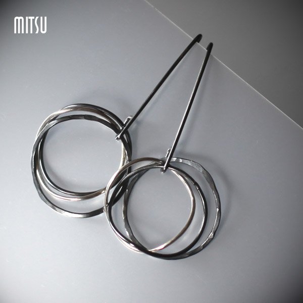 Kolczyki wykonane od podstaw ze srebra próby 925. Są leciutkie i bardzo wygodne. Mierzą ok 5 cm. Dwa oksydowane koła stanowią tło, które wydobywa blask z trzeciego koła - polerowanego na połysk. Kolczyki są proste, jednak prawdzie dodają elegancji. Świetnie uzupełnią casualowy look.
