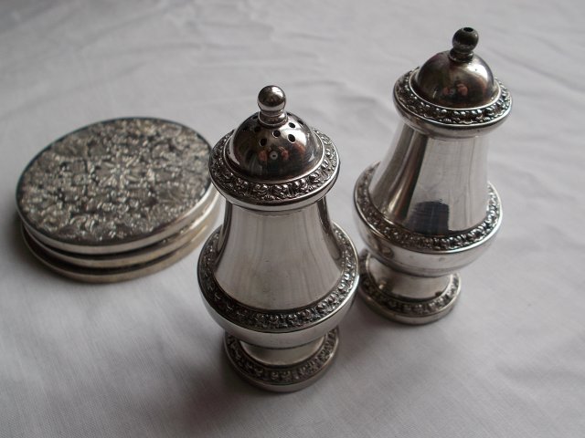 Srebrzone przyprawniki dwa :) Sygnowane JANTHE Made in England; Pieprzniczka dodatkowo z Silverplated na boku. Elegancka i ponad czasowa forma i zdobienie. Zatyczki - koreczki od spodu,na gorze dziurki; Pieprzniczka stan zachowania bdb,solniczka nieco gorszy - była częściej używana ...takie cztery z plusem :)