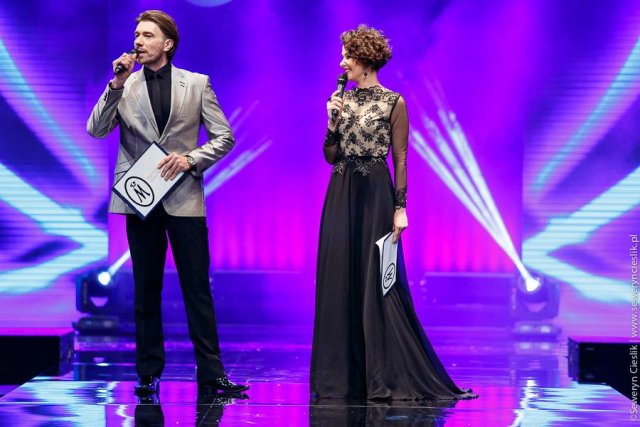 Suknia wieczorowa z kolekcji Couture odcięta w talii. Góra z ekskluzywnej koronki z koralikami na podszewce z cielistej dzianiny. Tył imituje dekolt na plecach.Rękawy z siateczki zakończone ozdobami. Od talii aplikacje schodzą na szyfonowy dół z pół koła, delikatnie umarszczony po środku, na podszewce. Zamek kryty z tyłu, tren, długość na wzrost 175 cm. (Można skrócić).