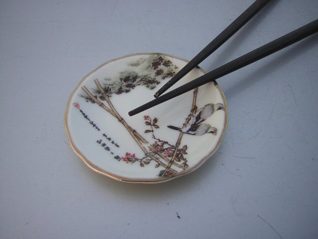 Niewielki Porcelanowy talerzyk. Ciekawe zdobienie - nadruk. Kolory stonowane, żywe. Rant falbankowy, złocony. Od spodu nalepka papierowa Simco art ware japan. Wykończenie satynowo - błyszczące. Góra nie całe 8 cm dół 4,5 cm wys, 1 cm