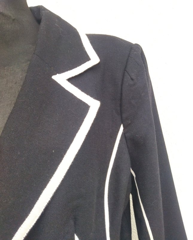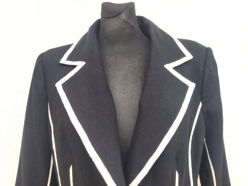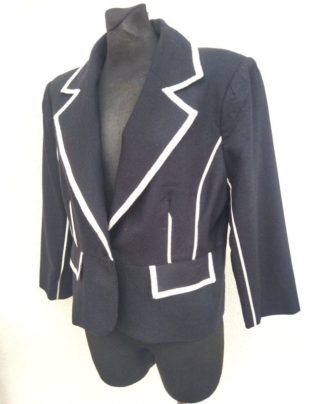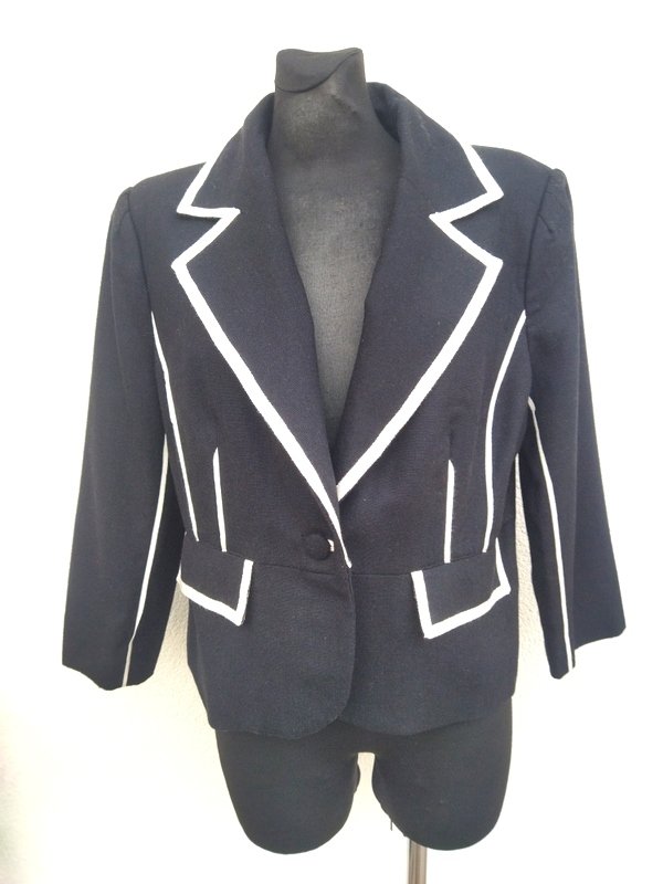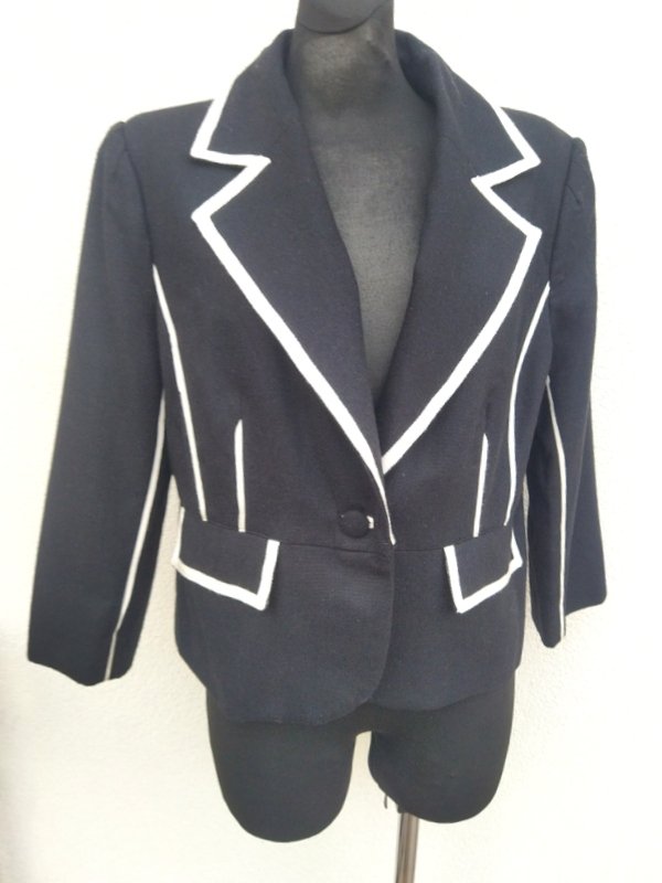 Zgrabna marynarka z dobrej jakości tkaniny w czarnym kolorze z dużym udziałem wełny z białymi lamówkami. Z kołnierzem z rewersami, z dwiema wpuszczanymi kieszeniami z patkami. zapinana na jeden oblekany tkanina guzik. Całość na eleganckiej podszewce.