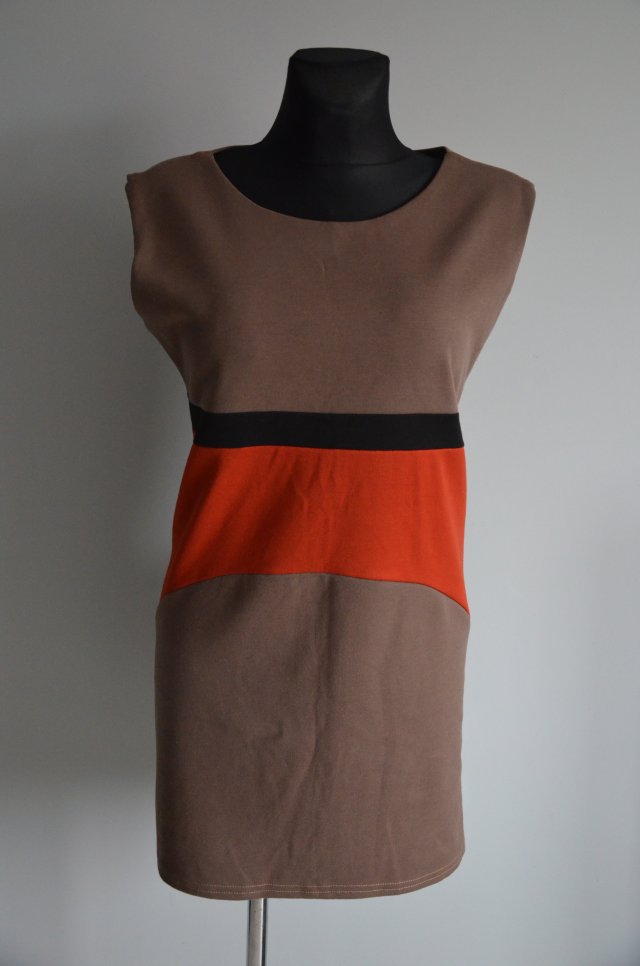 Elegancka sukienka w modnym kroju Simple. W kolorze ciemnego beżu. Pod biustem odcinana czarnym pasem. Ozdobny geometryczny wzór na przodzie w kolorze pomarańczowym świetnie ukryje niedoskonałości figury. Dekolt w łódkę. Rękawy zcięte, proste. Materiał grubszy, elastyczny.
