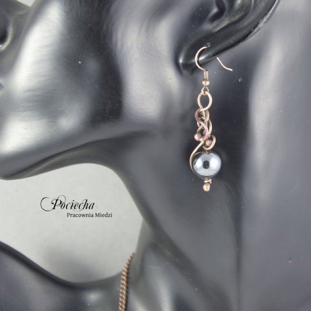 Oryginalne kolczyki stworzone ręcznie z miedzi. Ręcznie formowane elementy połączyłam z kulami hematytu o średnicy 10 mm. Kolczyki mają długość całkowitą ok. 5,5 cm. Bigle w kolorze antycznej miedzi, antyalergiczne.