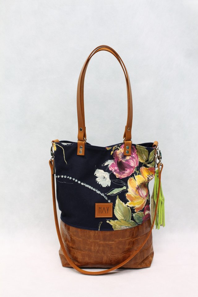 Torba wykonana z pięknej, bawełnianej tkaniny i skóry naturalnej ( dół torby, brelok oraz rączki i pasek). Torebka zapina się na zatrzask, wewnątrz ma trzy kieszonki ( w tym jedna na zamek). Wymiary: ok. 39 x 47 cm.