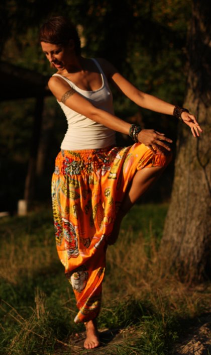 Spodnie sindbady w kolorowe wzory(przewaga żółtego koloru).Bardzo wygodne.Stan:dobry.Rozm:S lub M