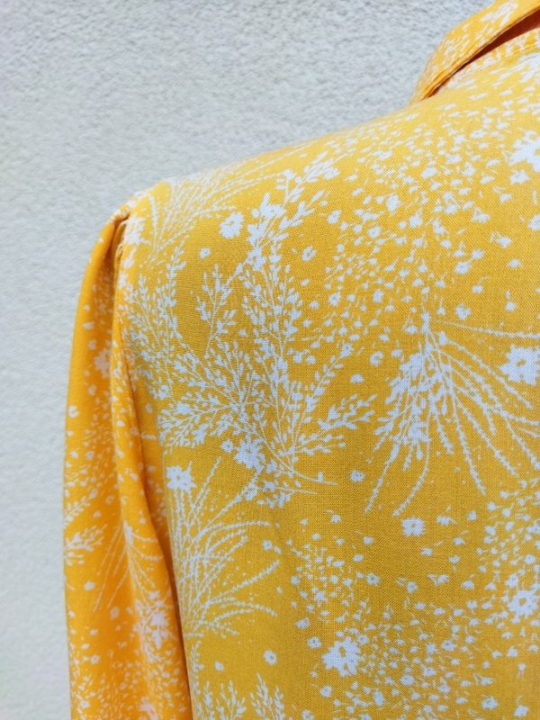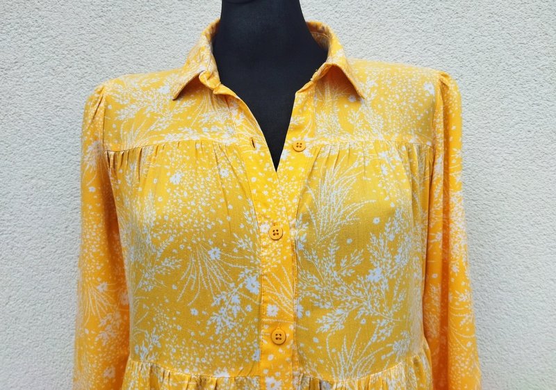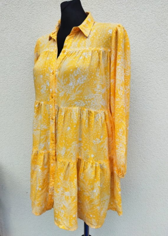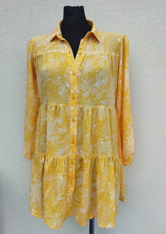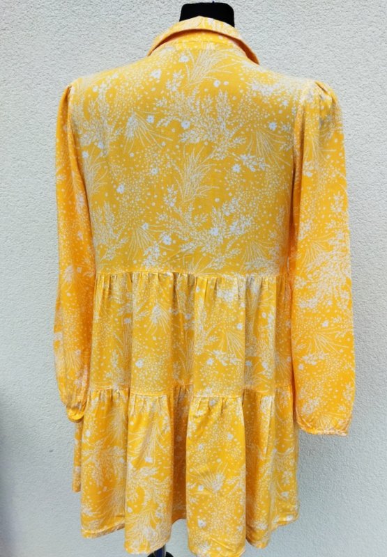 Krótka sukienka lub tunika o swobodnym kroju z marszczonymi falbanami, z przewiewnej wiskozowej tkaniny z roślinnym wzorem w kolorystyce żółci i bieli. Z kołnierzykiem na stójce , z dwiema wpuszczanymi kieszeniami w szwach bocznych, zapinana na całej długości na małe guziczki