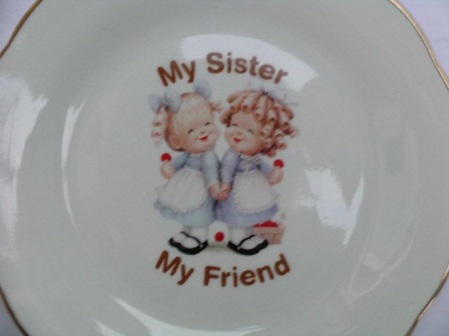 Uroczy talerz porcelanowy z fantastycznym przesłaniem :) Moja Siostra - moja miłość :) Rant falbanowany, złocony; błyszczące szkliwienie. Dekoracyjny - z tyłu profesjonalny uchwyt do zawieszenia. 17,5 x 1,5 cm. Stan zachowania bardzo dobry.