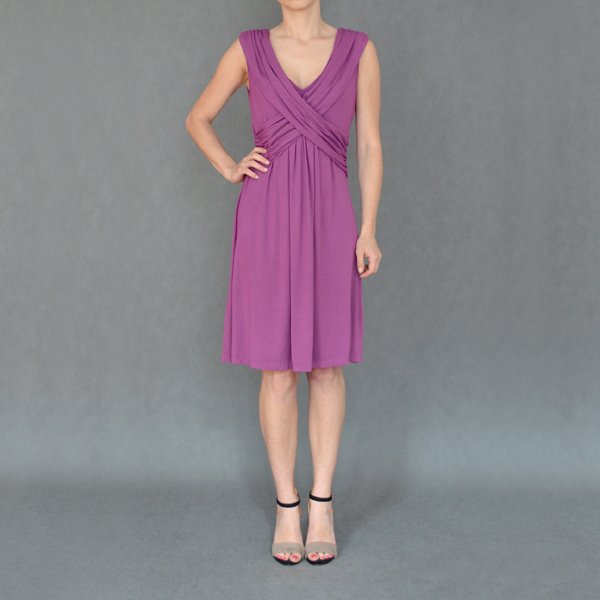 Sukienka z lejącej dzianiny marki SISLEY. W kolorze fioletowym, wpadający w amarant, nie jakoś strasznie intensywnym. Od ramiona idą dwa skrzyżowane, udrapowane pasma. Polecam.