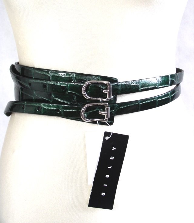 NOWY z metką pasek firmy SISLEY.Uszyty z ciemno zielonego syntetyku z wzorem skóry krokodyla.Część z dwoma klamerkami szersza 6 cm.dł 41 cm.zwężająca się.Druga część to dwa paski szerokości 1,5 cm.długości 54 cm.stan bardzo dobry.