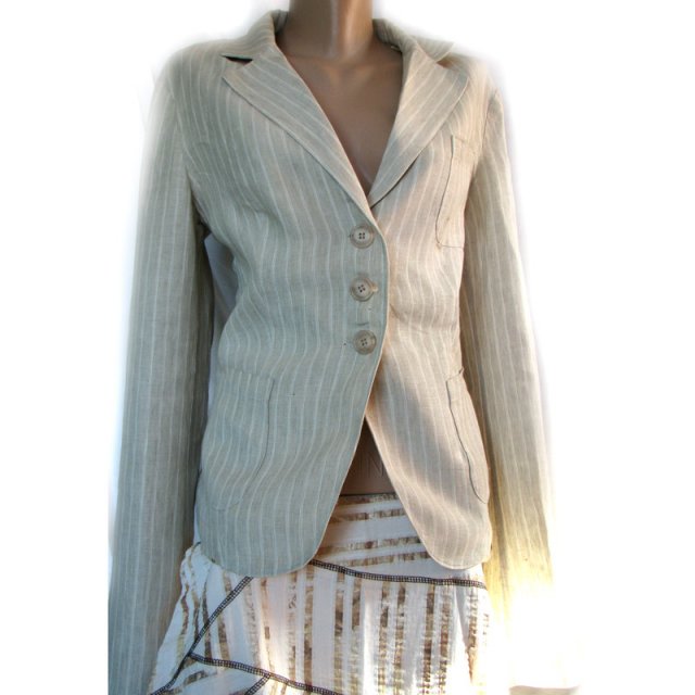 Żakiet w delikatne prążki w rozmiarze 44 firmy SISLEY zapinany na brązowo-beżowe guziki. Wymiary: biust 48 cm, talia 44 cm, biodra 49cm. Długość rękawa mierzona po zewnętrznej strony 70 cm. Długość żakietu 63 cm. Na przodzie żakietu naszyte wsuwane kieszonki. Zapinany na 3 guziki. Rękawy z ozdobnym pęknięciem.