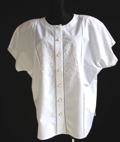Biała bluzka firmy Sixt Series C&A.Rozmiar 48.Materiał 65% poliester + 35% bawełna.Rękaw krótki,kimono.Zapinana z przodu na ozdobne,białe guziczki na srebrnym spodzie.Przód ozdobiony pięknym haftem i mereżką.Po bokach okrągłe rozporki.Poduszki w ramionach.Stan bardzo dobry.Długość 71 cm.pod pachami 136 cm.