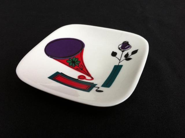 Nieodpartego uroku porcelanowy spodek-talerzyk z wzorniczo fantastycznym zdobieniem z lat 60-tych. Oryginał, sygnowany, także datą 16 sierpnia 1966. 10,5 x 12,5 x 2 cm. Użytkowy i w świetnym stanie zachowania.