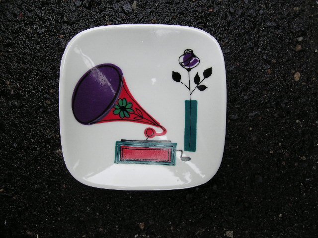 Nieodpartego uroku porcelanowy spodek-talerzyk z wzorniczo fantastycznym zdobieniem z lat 60-tych. Oryginał, sygnowany, także datą 16 sierpnia 1966. 10,5 x 12,5 x 2 cm. Użytkowy i w świetnym stanie zachowania.