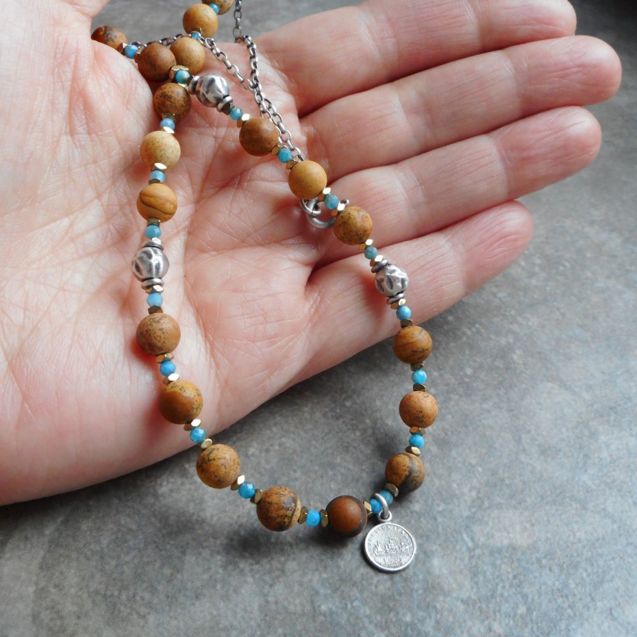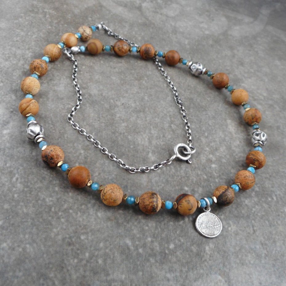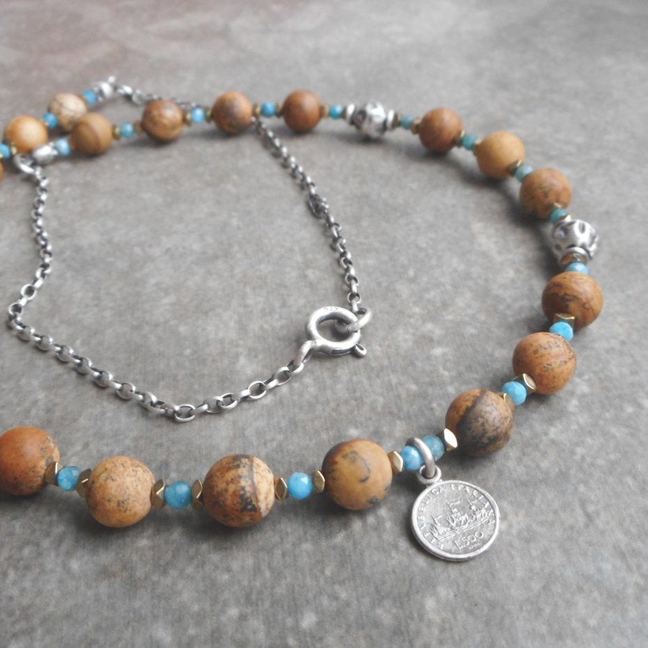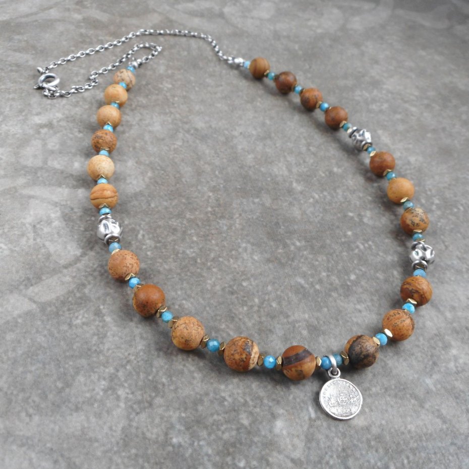Bardzo kobiecy naszyjnik wykonany ze szlachetnego srebra i kamieni naturalnych; zestawione ze sobą kontrastowo brązy i błękity, ozdobione małą zawieszką w formie monety.