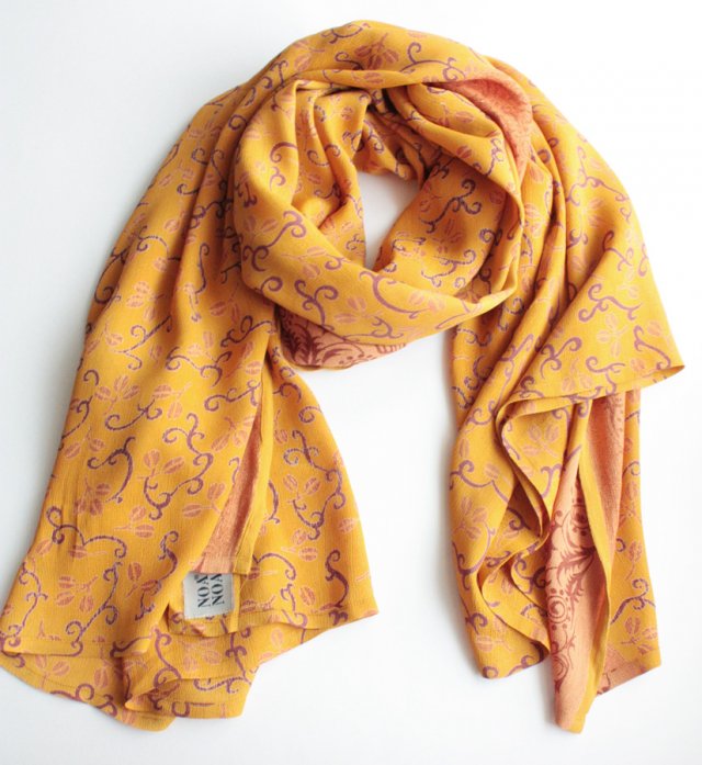 Duży, oryginalny szal skandynawskiej marki NOA NOA w miodowym odcieniu. Szal jest bardzo szeroki, można zaaranżować go na wiele sposobów. Materiał to prawdopodobnie wiskoza.