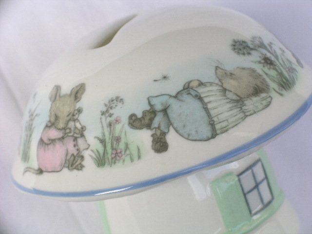 Fantastyczna, szlachetnie cienko-porcelanowa, leciutka skarbonka, sygnowana. Ręczne malowanie domkowych drzwi i okien i bajkowo-ilustratorski wzór śpiących maleństw na kapeluszu. Od spodu duża plastikowa zatyczka. Dół 6; góra 9,5; wysokość 7,5 cm. Stan zachowania bardzo dobry. Fantastyczna na prezent dla Dziecka :)