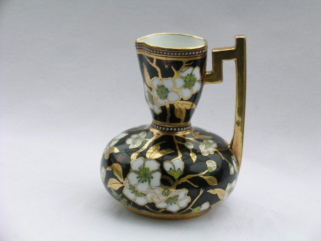 Szykownie dekoracyjny porcelanowy wazonik dawnej daty, pięknie ręcznie malowany w jaśminowy motyw z bogatym złoceniem. Kropkowane szlaczki lekko wypukłe. Elegancja wyszukanej, arabizującej formy, no i ten uchwyt - jakby art deco i starożytny sumer zarazem... Od spodu, na denku widoczne nadpęknięcie, ale sam wazonik nie przecieka. Dół 9; góra 4,5; wysokość 11,5 cm. Stan zachowania dobry. Przedmiot z duszą; o niezaprzeczalnej, dekoracyjnej elegancji :)