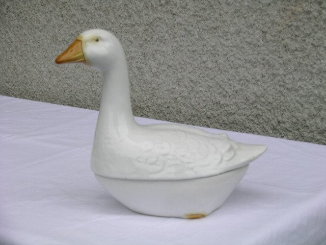 Imponująco duża, szlachetnie fajansowa i w całości ręcznie wykonana gęś - naczynie z przykrywką. Z kolekcjonerskiej, poszukiwanej, francuskiej serii zwierząt autorstwa Michela Caugant. Sygnowana od spodu. Artystycznie szkliwiona, ręcznie malowana. Rarytas dla kolekcjonera i doskonała ozdoba domowej kuchni :) Super prezent ;)