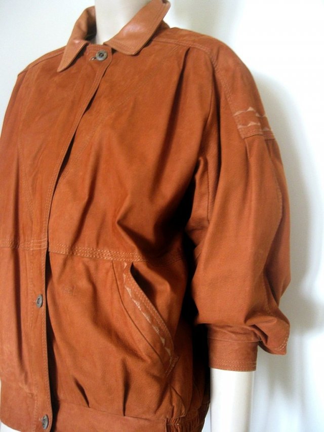 Kurtka vintage produkcji fińskiej, z naturalnej cudownie miękkiej i lekkiej skóry nubukowej czy irchowej. Kołnierz i wykończenie wnętrza ze skóry gładkiej. Stan bardzo dobry, jeśli używana to niewiele. Ozdobne przeszycia na rękawach i kieszeniach. Zapinana na zamek i dodatkowo na guziki. wewnątrz kieszonka na zamek, w ramionach poduszki raczej do usunięcia (łatwo to zrobić przez rękaw). Rozmiar z metki 38. Na manekinie o taki rozmiarze. powinna pasować na 38-42. Podaję wymiary mierzone na płasko;
