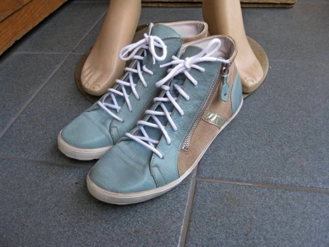 nieocieplone sportowe buty ze skóry naturalnej i zamszowej, marki relaxshoe. kolor rozbielony turkus, mięta. wstawki beżowe z zamszu. zapięcie z boku na zamek. niewielkie ślady normalnego użytkowania. rozmiar 38.