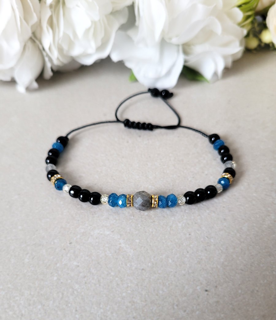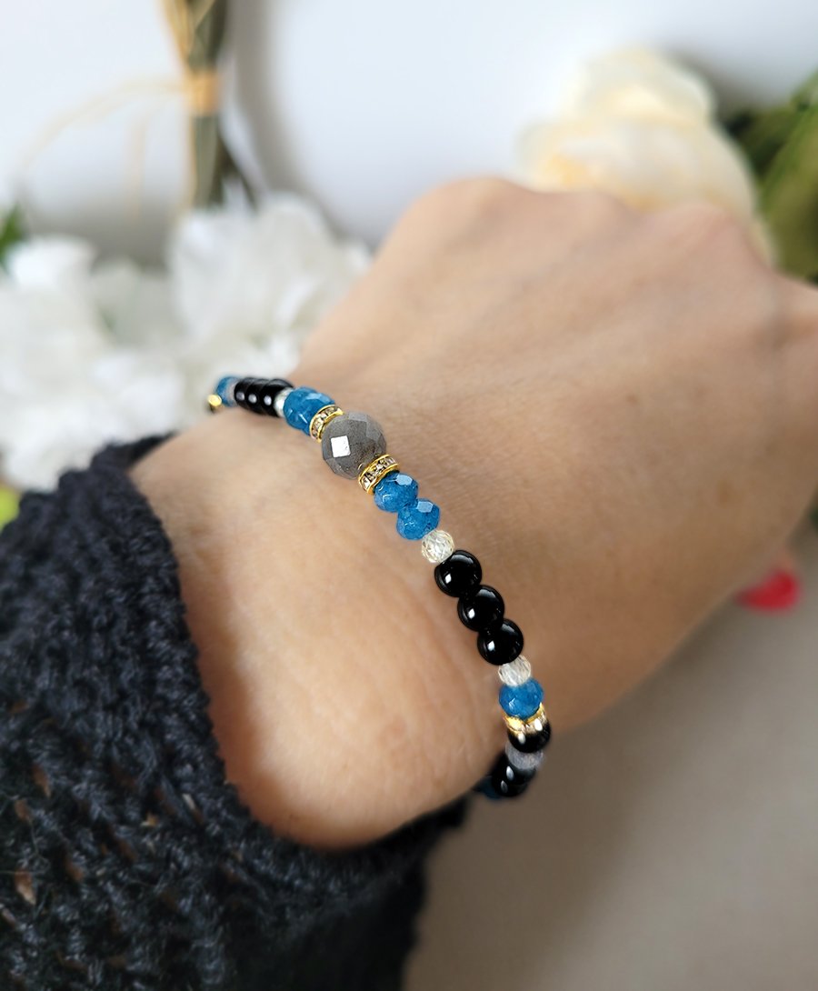 Damska bransoletka z kamieni naturalnych: Labradorytu, Agatu, Onyksu oraz z Cyrkonii głównie przeznaczona dla zodiakalnego Skorpiona.