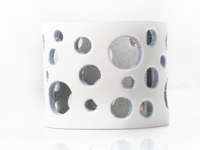 Bransoletka wykonana ze skóry naturalnej w kolorze białym z ciekawą fakturą skóry na zewnętrznej stronie bransoletki. Całkowita długość bransoletki 19,5cm a szerokość 5cm. Wybite większe i mniejsze kółka sprawiają, że bransoletka posiada oryginalne i niepowtarzalne wzornictwo.