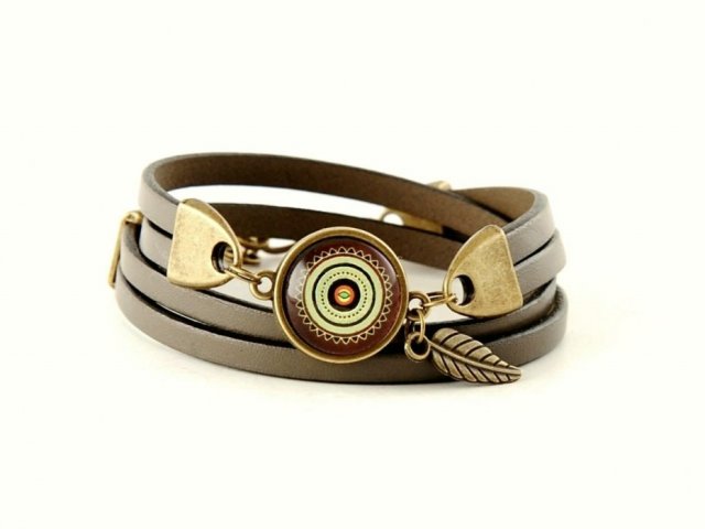 Ozdobą bransoletki jest grafika wykonana pod kolor, umieszczona za wypukłym szkłem ( kaboszonem) o średnicy 16 mm, w oprawie. obok wisi drobny listek.