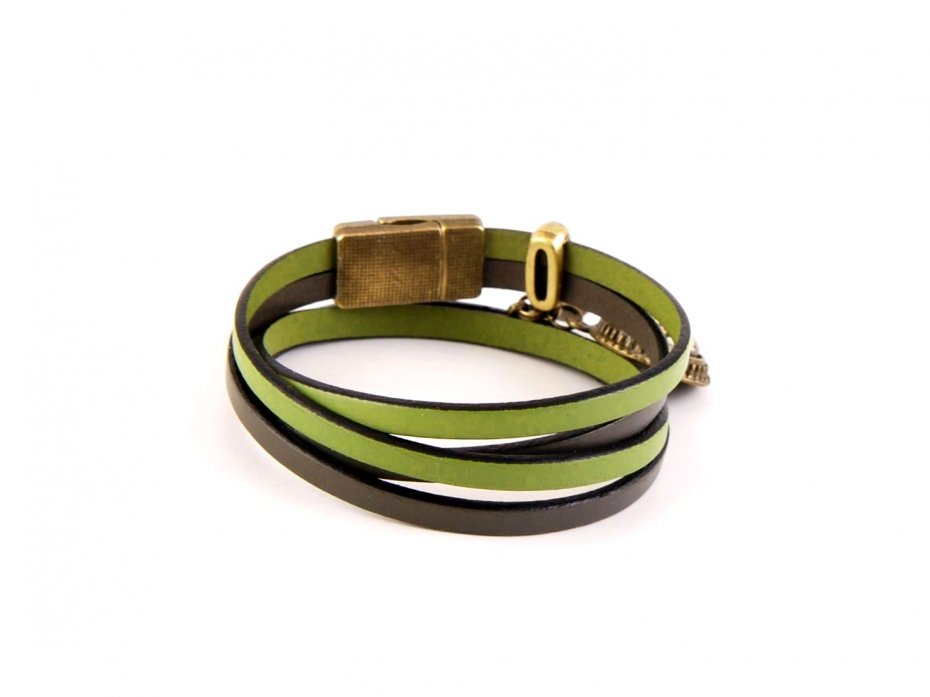 Ta elegancka i subtelna bransoletka jest wykonana z wysokiej jakości skóry naturalnej oraz dodatków w kolorze starego złota. Skórzany pasek ma szerokość 5 mm każdy. Szerokość bransoletki po założeniu: około 25 mm. Kolory: oliwkowy, khaki.