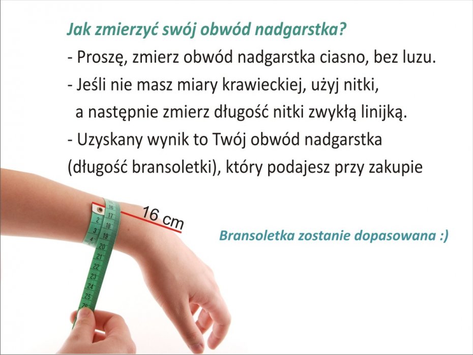 Jeśli to możliwe proszę przed zakupem sprawdzić obwód nadgarstka ( mierzonego tuż za kostką, bez luzu) i wpisać rozmiar w komentarzu do zamówienia, gdyż bransoletka nie ma regulacji i najlepiej zamówić odpowiedni rozmiar)