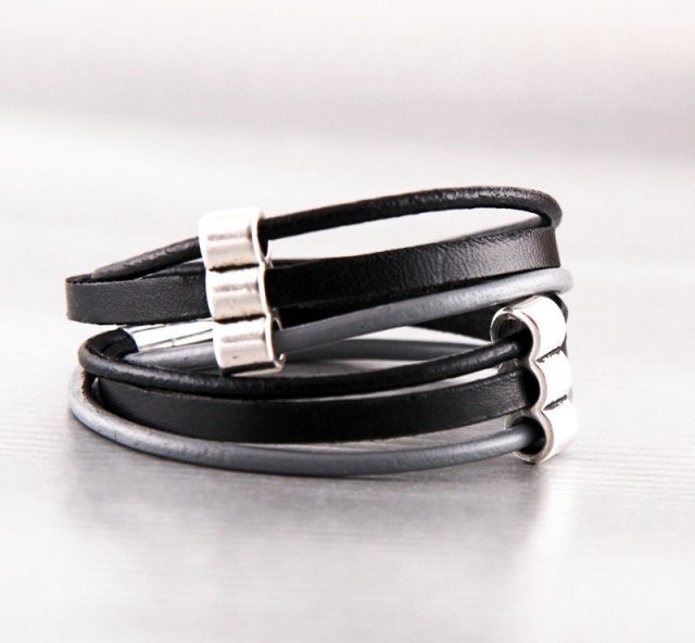 Ta wygodna bransoletka jest wykonana ze skóry naturalnej - okrągłych rzemyków w kolorze czarnym i szarym oraz płaskiego paska skórzanego.