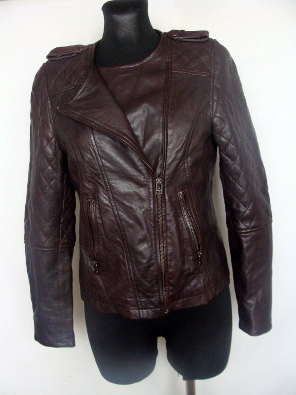 Kurtka typu ramoneska z miękkiej naturalnej skóry licowej w brązowo-bakłażanowym kolorze z licznymi detalami. Taliowana , bez kołnierza , z pikowanymi rękawami i karczkiem, z pagonami na ramionach, z dwiema wpuszczanymi kieszeniami z zamkami. Mankiety rękawów z rozsuwanymi zamkami. Zapinana z przodu na zamek. Na podszewce.
