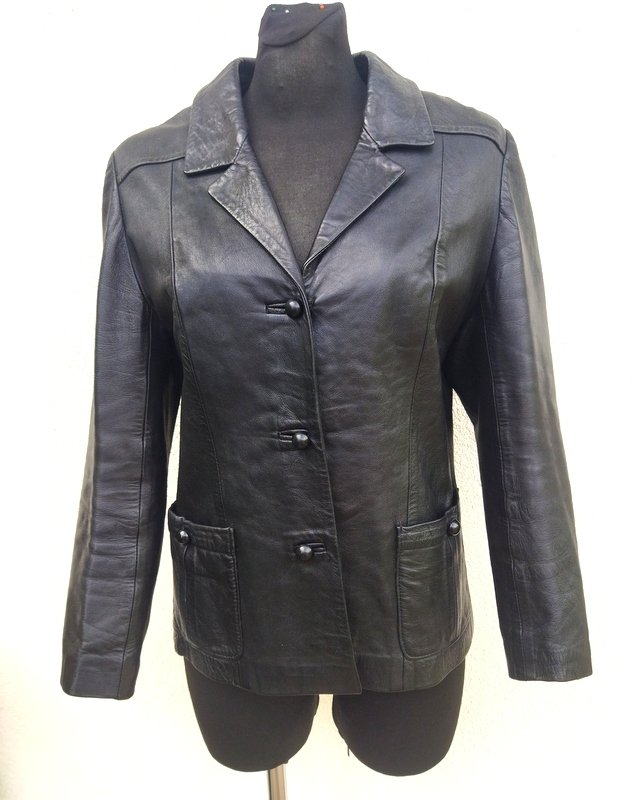 Kurtka/marynarka z dobrej jakości miękkiej naturalnej skóry licowej w czarnym kolorze. Z kołnierzem z rewersami , z dwiema naszywanymi kieszeniami, z krytym rozcięciem z tyłu u dołu. Zapinana na kuliste guziki. Całość na podszewce.