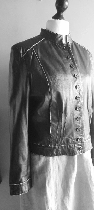miękka skóra, dekoracyjne przeszycia, ponadczasowy fason, stan idealny, założona kilka razy, długość 56, biust 55x2 , pas 48x2 manekin 38/40