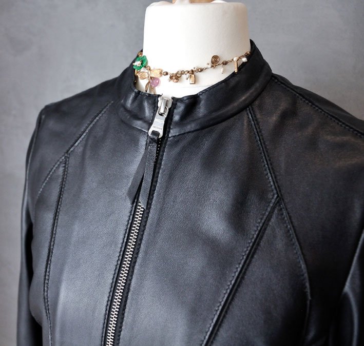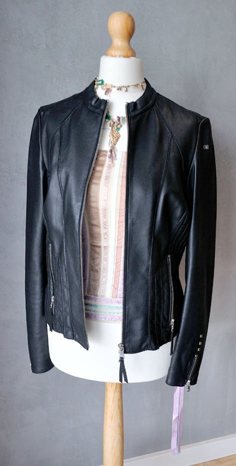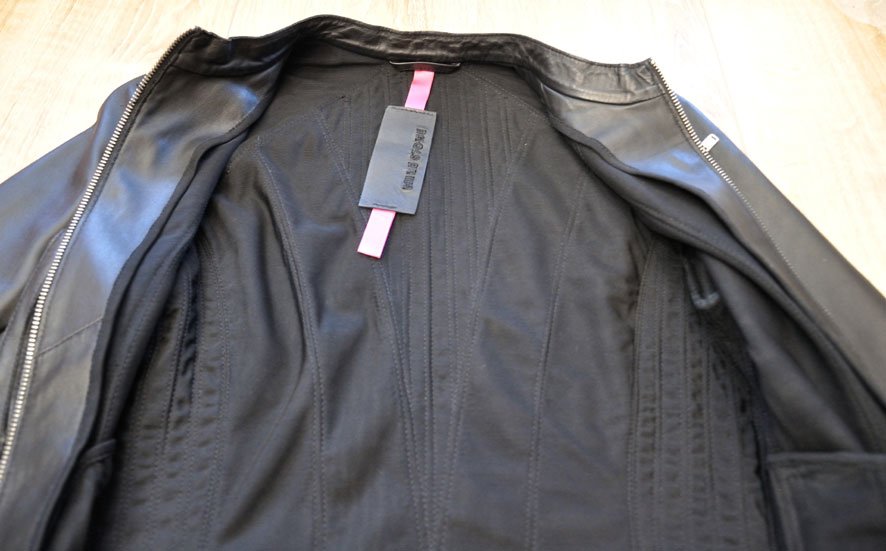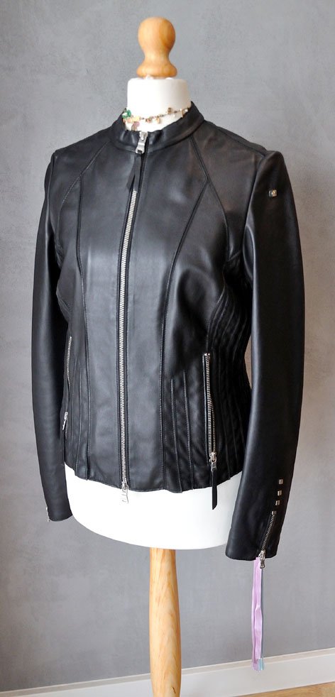 Wykonana ze skóry jagnięcej, składa się z mnóstwa paneli, nałożonych na siateczkową bazę (dzięki czemu delikatna skóra nie jest poddawana dużym naprężeniom przy noszeniu - będzie dłużej świetnie wyglądać). Fason pięknie dopasowuje się do sylwetki. Z jednej strony bardzo rockowy projekt, srebrne detale (zamki, delikatne ćwieki na rękawach), a z drugiej - elegancki fason na co dzień. Kurtka jest stonowana, nie ma tu przesady ani kiczu.