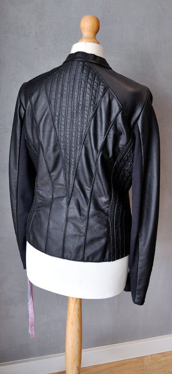 Wykonana ze skóry jagnięcej, składa się z mnóstwa paneli, nałożonych na siateczkową bazę (dzięki czemu delikatna skóra nie jest poddawana dużym naprężeniom przy noszeniu - będzie dłużej świetnie wyglądać). Fason pięknie dopasowuje się do sylwetki. Z jednej strony bardzo rockowy projekt, srebrne detale (zamki, delikatne ćwieki na rękawach), a z drugiej - elegancki fason na co dzień. Kurtka jest stonowana, nie ma tu przesady ani kiczu.