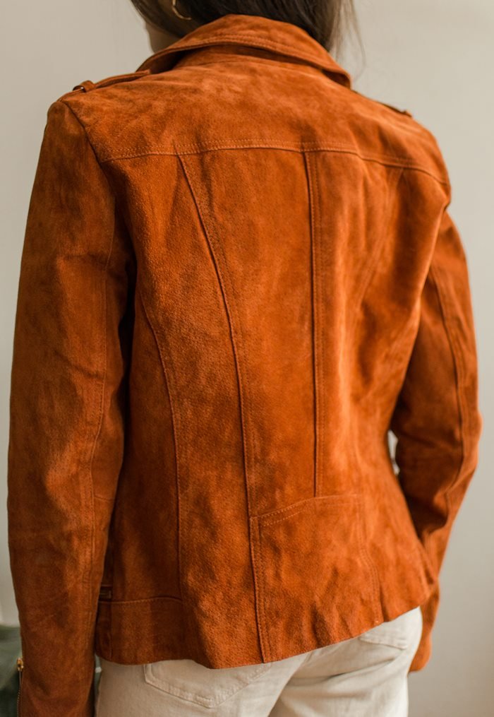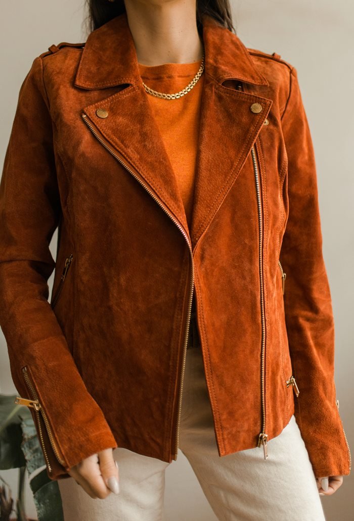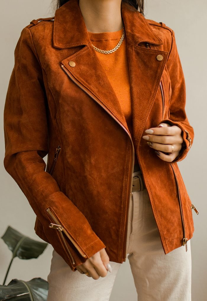 Ciemnopomarańczowa skórzana kurtka. Kolor na żywo może nieco się różnić.