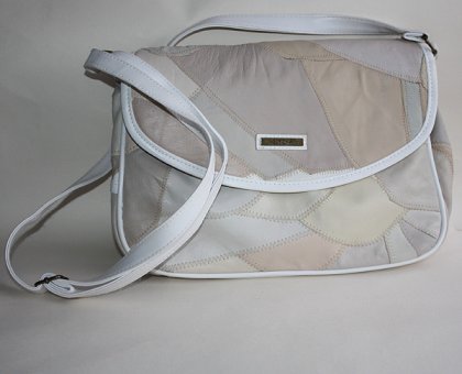 Beżowa torba z łatek ze skóry naturalna wykończonej ekologiczną na pasku i obszyciach (wg mojej oceny materiału;brak oznaczenia na torbie).