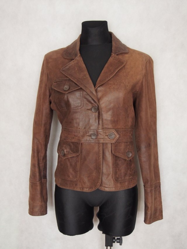 Świetna kurtka ze skóry marki Amisu. Przyda się na długie lata jako świetny dodatek do sukienek, spodni. Na wyjścia mniej i bardziej oficjalne. Dwie kieszonki. Zapinana na guziki. Na podszewce - nie wiem z czego ponieważ metka została odcięta.