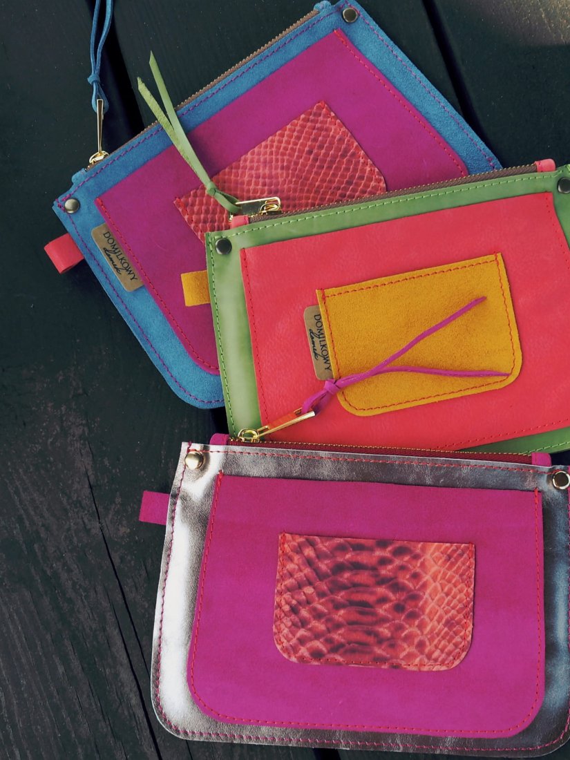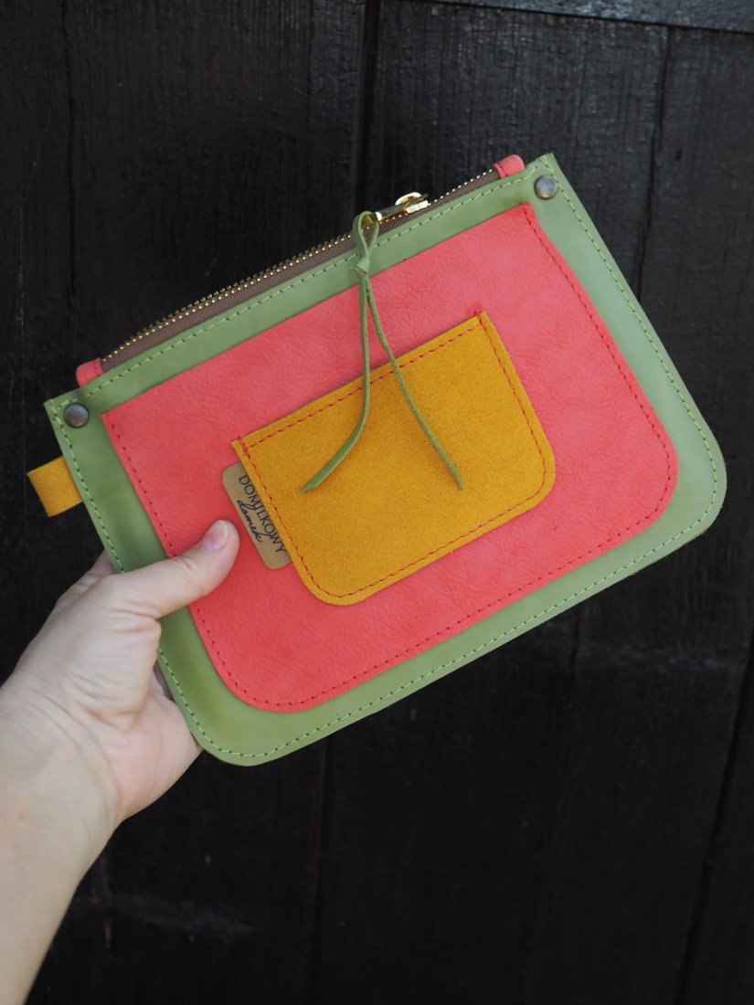 Saszetka Bella uszyta została z połączenia kolorowych skór: licowych, zamszowych oraz nubuku.
