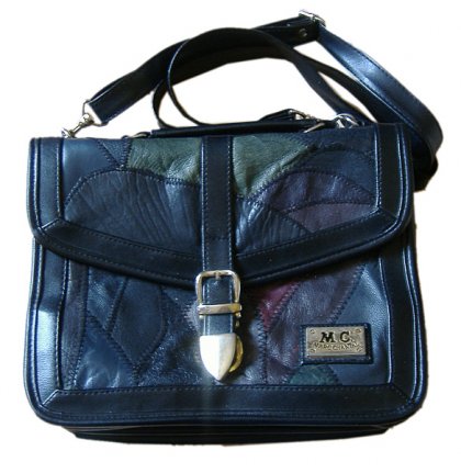 Skórzana torebka z łatek w różnych kolorach: zielony, fiolet, granat itd. Miękka i lekka. Wewnątrz cztery komory zapinane na zamek. Pasek odpinany i regulowany + rączka do trzymania. Wymiary: około 26x20 cm. Stan: bdb! NIE POCHODZI Z SECONDHANDU.