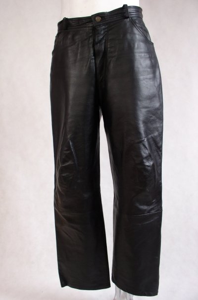 Spodnie męskie z czarnej skóry naturalnej.Na pasku w środku napis AUTHENTIC CLOTHING COMPANY.Rozmiar 26.Podszewka czarna,syntetyk.Zapinane z przodu na zamek + pasek na metalowy nap.Z przodu dwie ukośne kieszenie wpuszczany do środka + mała kieszonka.Z tyłu na pośladkach naszyte dwie kieszenie.Stan bardzo dobry,podszewki dobry w kroku zszyta ręcznie.Długość102 cm.pas 102 cm.biodra 120 cm.