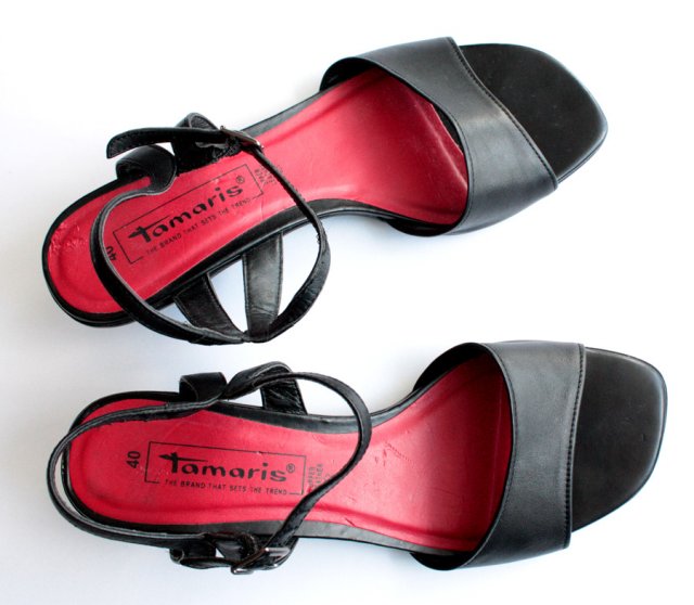 Czarne sandały na niewysokim obcasie wykonane z naturalnej skóry.
