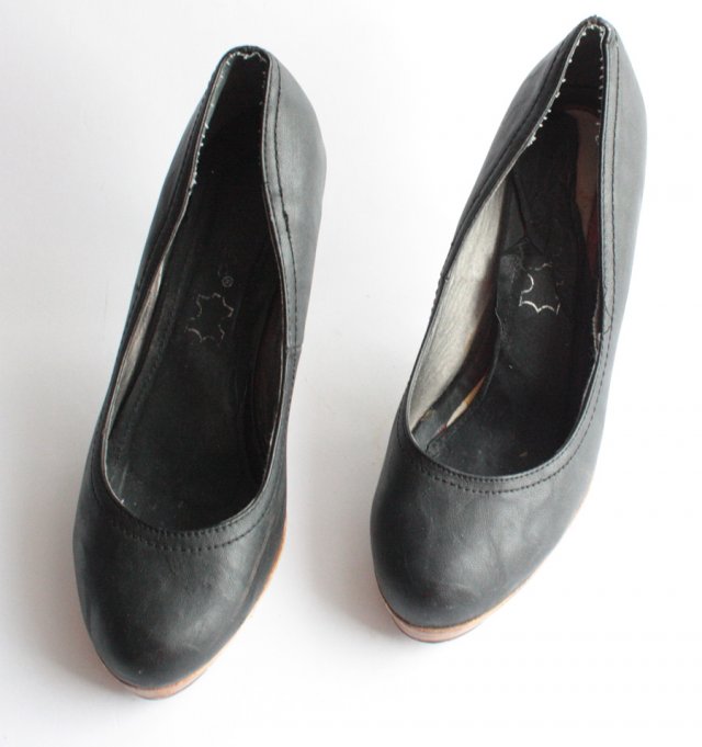 Czarne, oryginalne buty na obcasie i niewielkiej platformie. Według oznaczenia wykonane ze skóry. Drobne ślady użytkowania widoczne na zdjęciach. Gratis dołączam odświeżające białe wkładki widoczne na zdjęciu.
