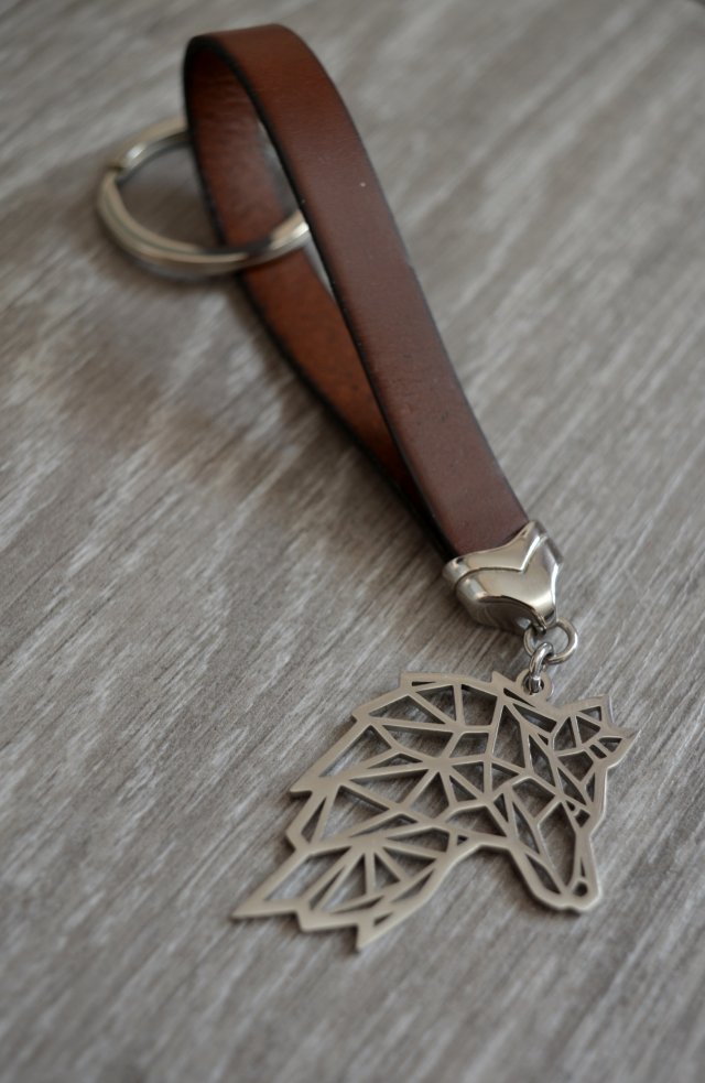 Brelok do kluczy wykonany z płaskiego, skórzanego rzemienia o szerokości 1cm w kolorze brązowym oraz elementów ze stali szlachetnej. Ozdobę breloka stanowi stalowa zawieszka w kształcie głowy wilka (46x30mm). Do umocowania kluczy służy okrągłe, solidne kółko o średnicy ok. 3cm ze stali szlachetnej.