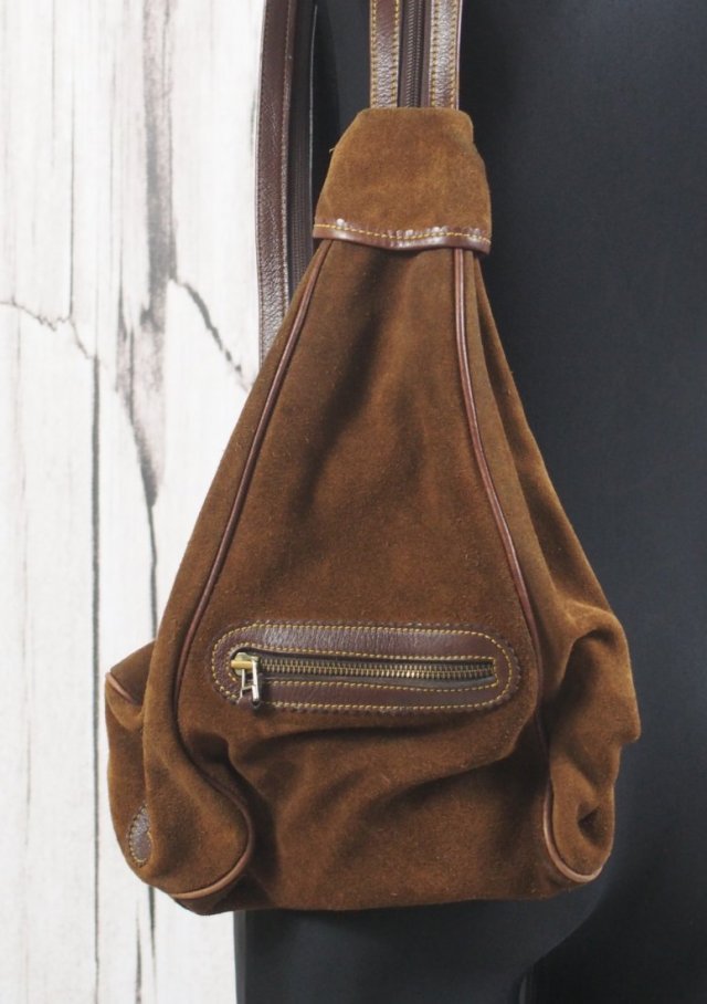 Plecak z nieoprawionej skóry, świetnie wykonany. Zapinany z boku. Także do noszenia jako torebka